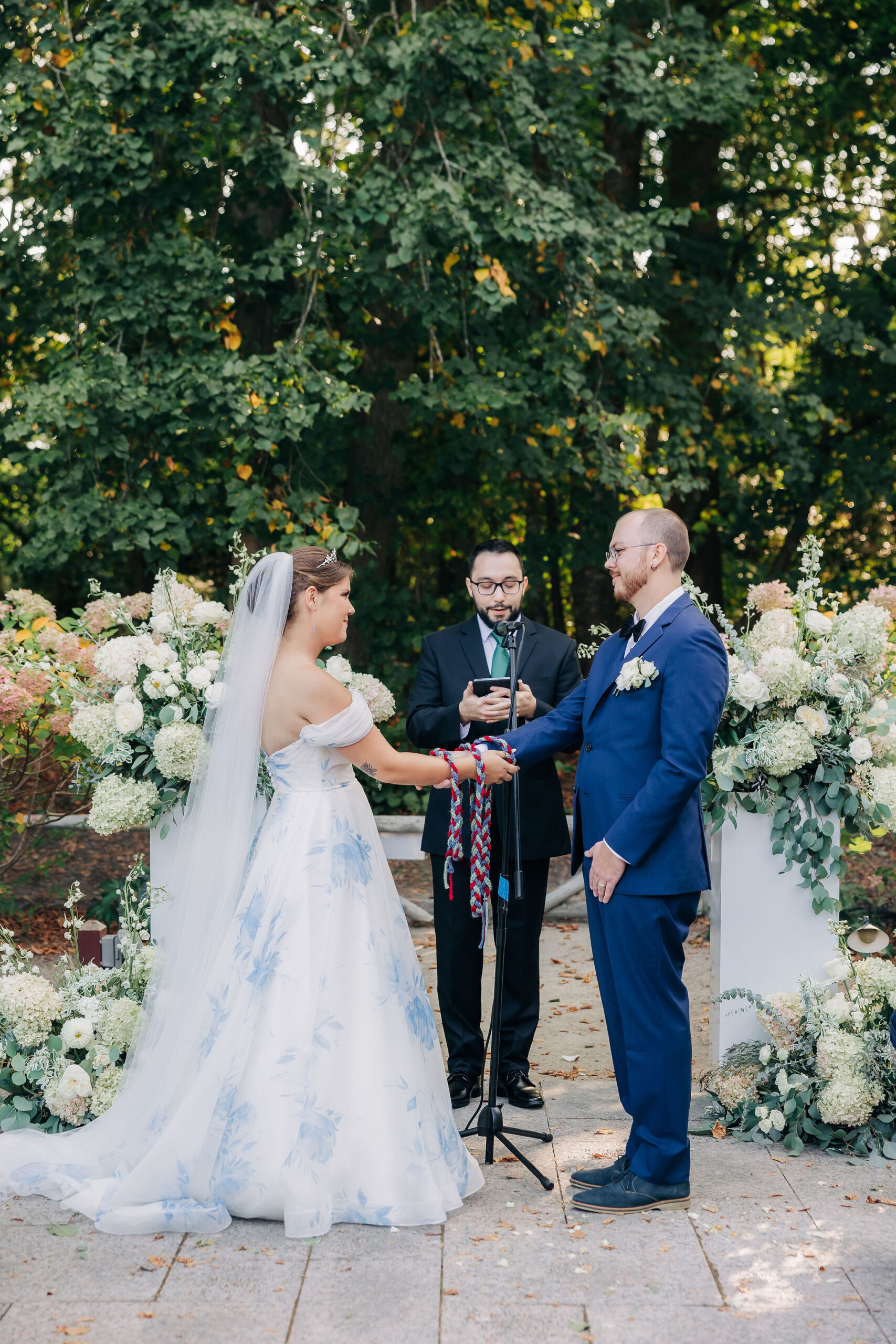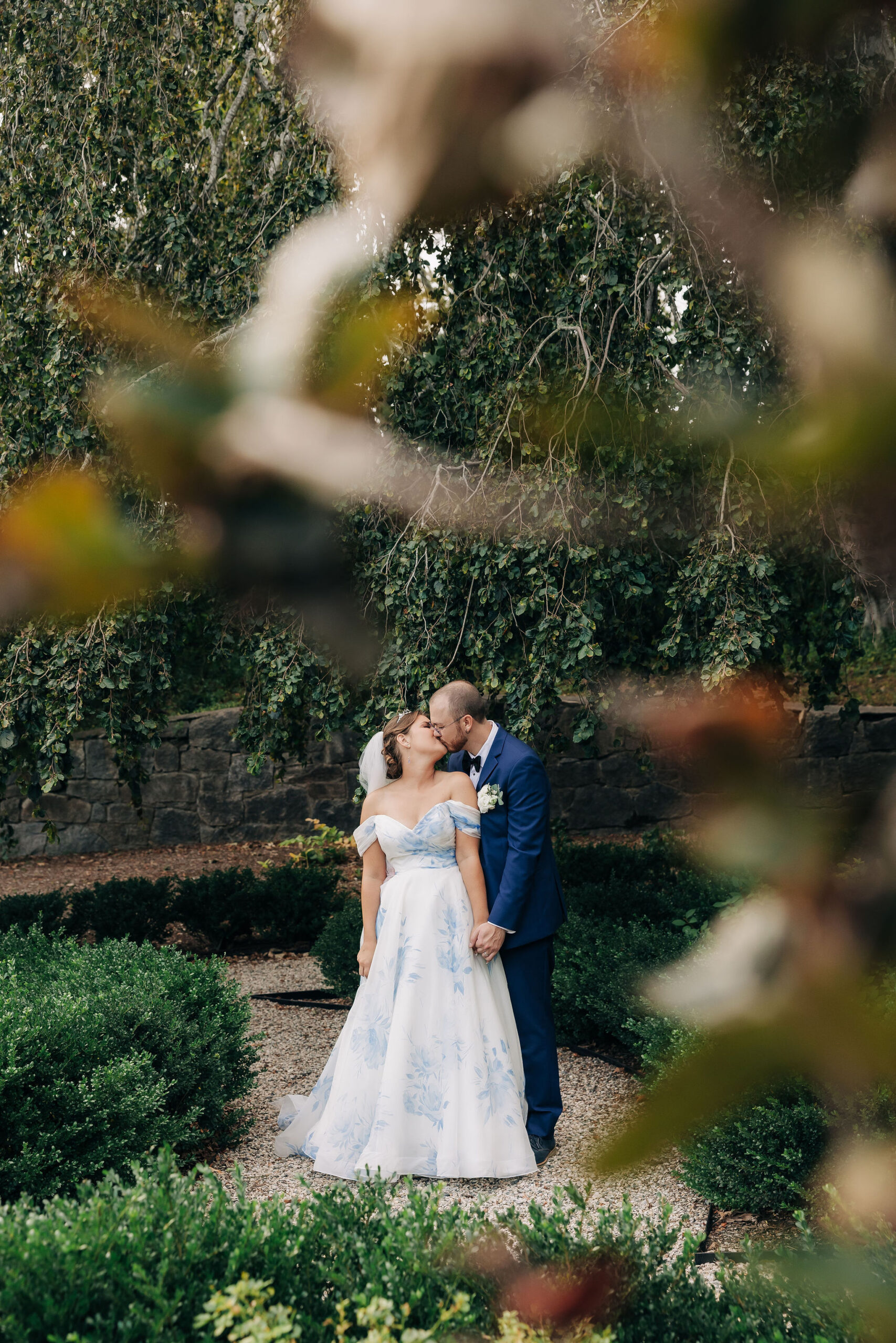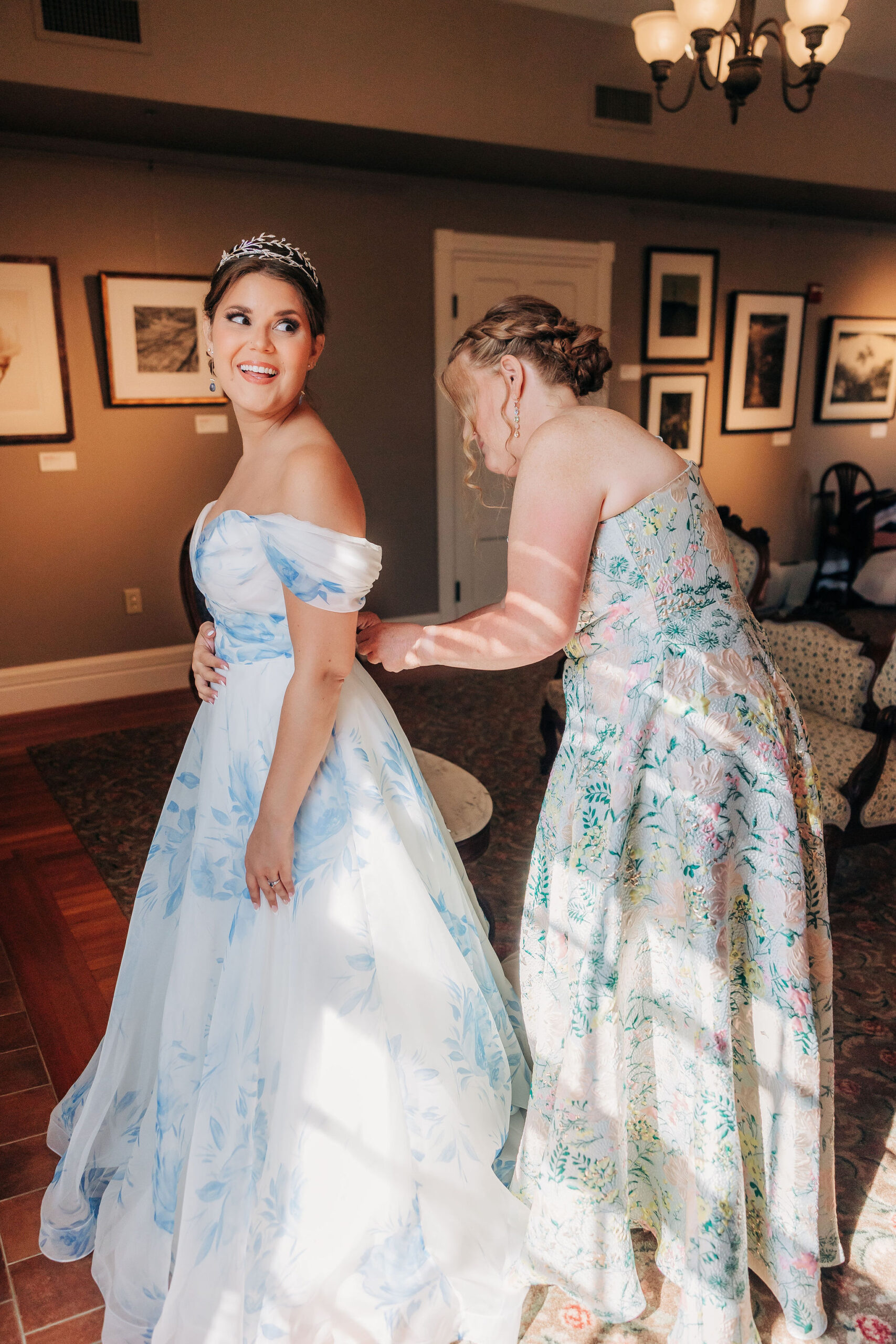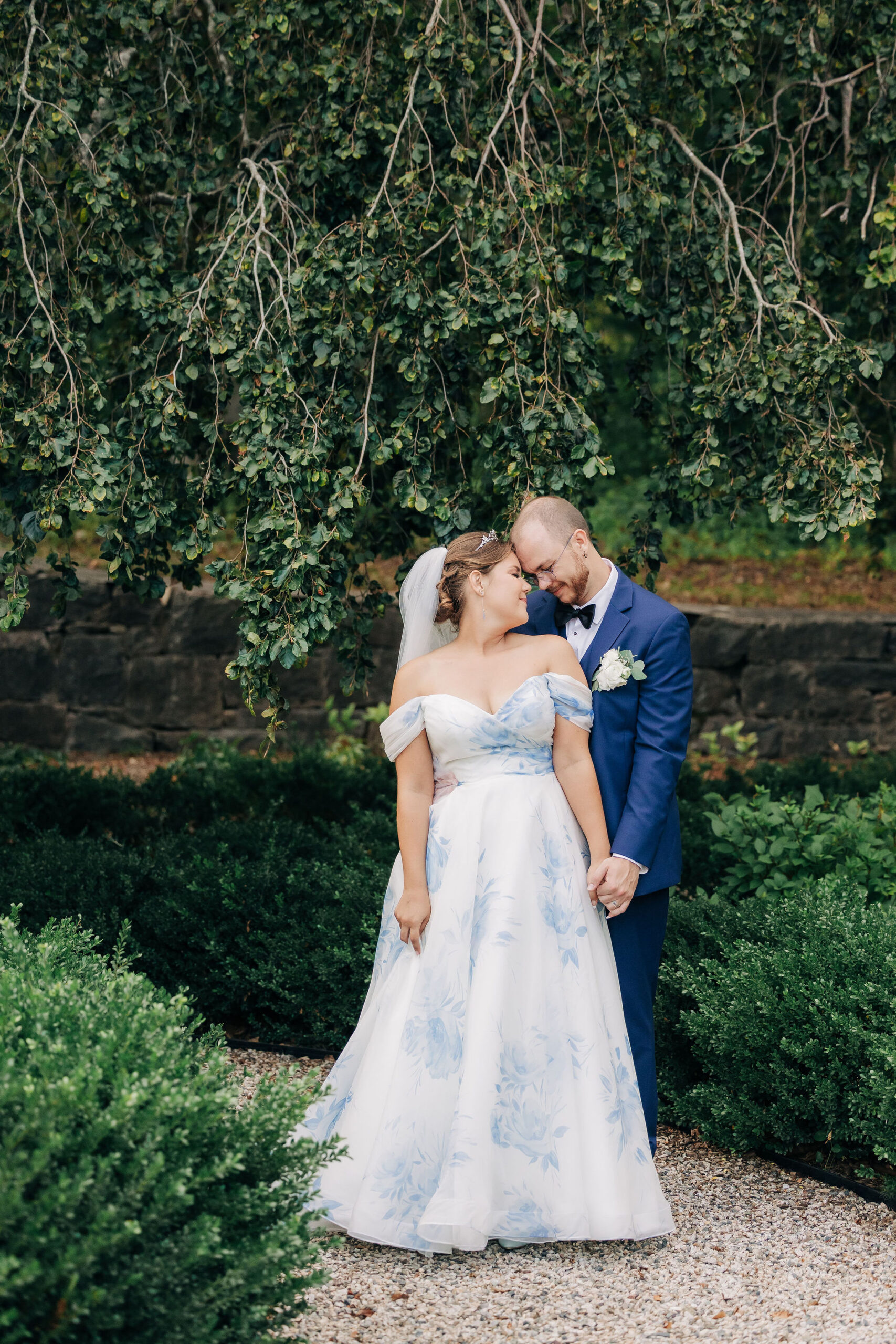 I knew for a long time that I didn’t want a fully white dress because I love color and I also wanted something unique! I wanted to tie the line of classy bridal with my own twist. Jared’s Aunt Julie showed me some pictures of dresses with prints and I fell in love with the idea of doing something like that. Julie suggested we go shopping at Your Dream Bridal in Sudbury, MA and as soon as I saw the Blythe dress I knew it was for me. It was the first dress I tried on and, even though I tried on a few other dresses, I knew it was my dress. I love the blue florals and the fabric is so light and comfortable it almost felt like I wasn’t wearing a dress. Julie is so spot on in reading each bride and figuring out what they are looking for!