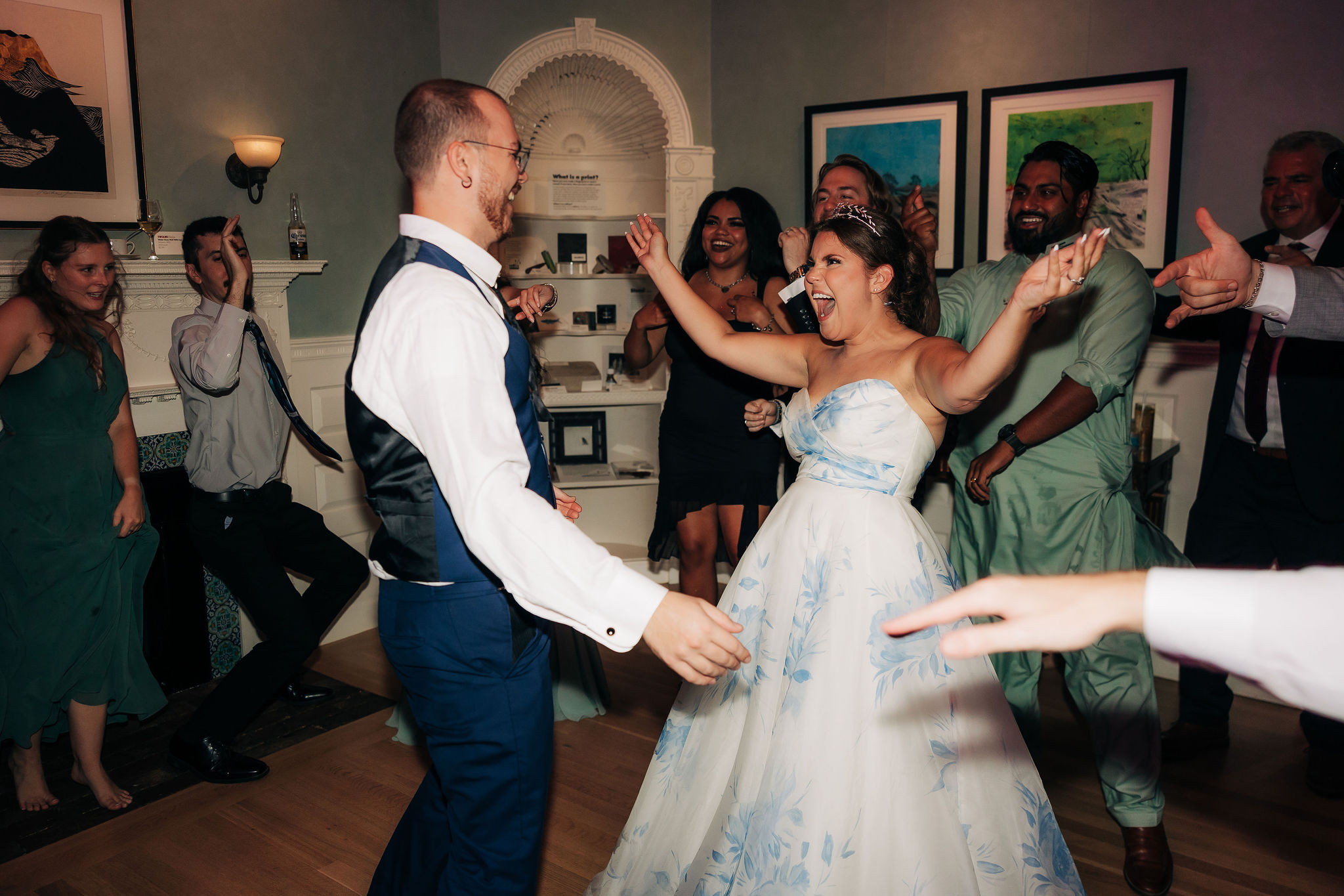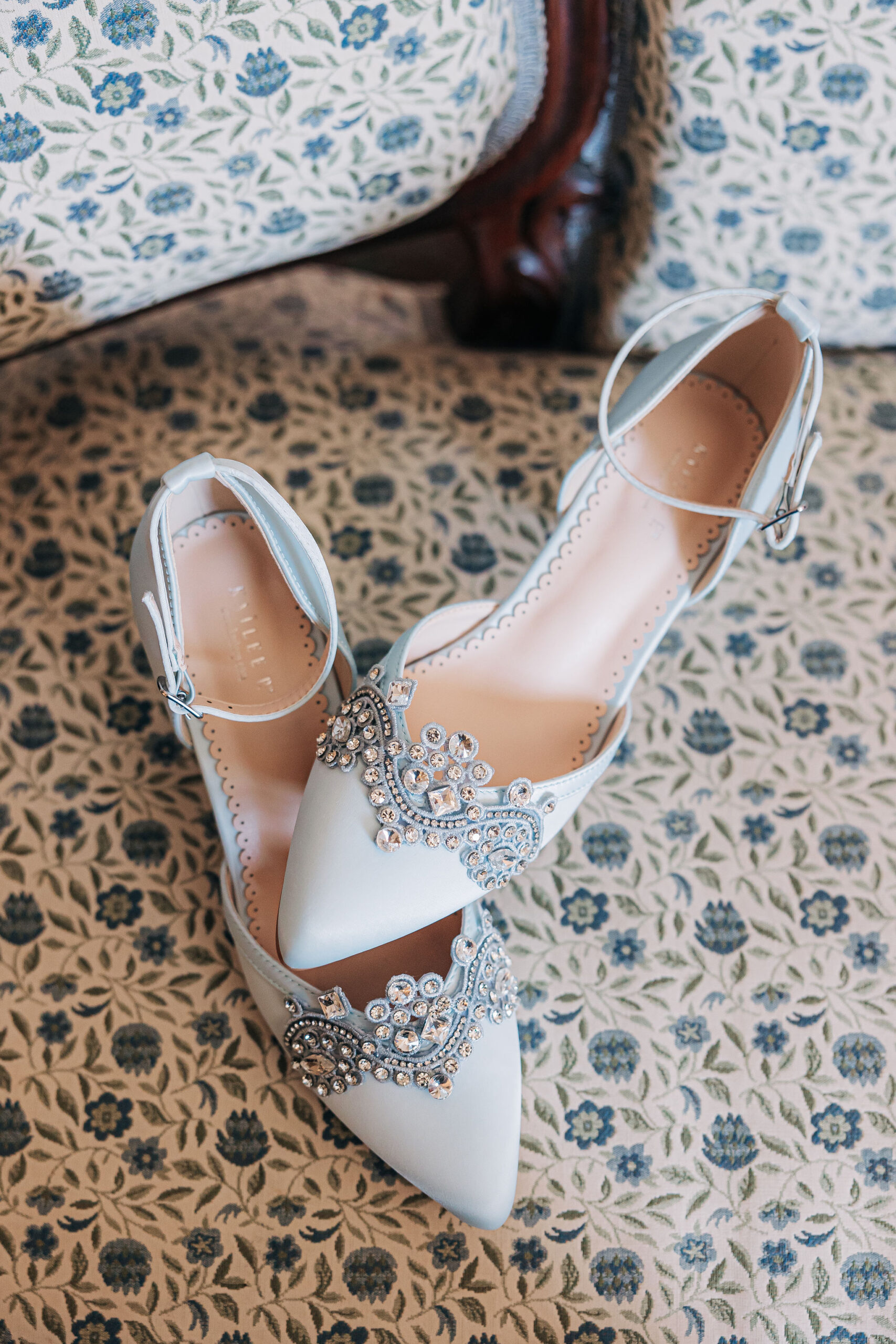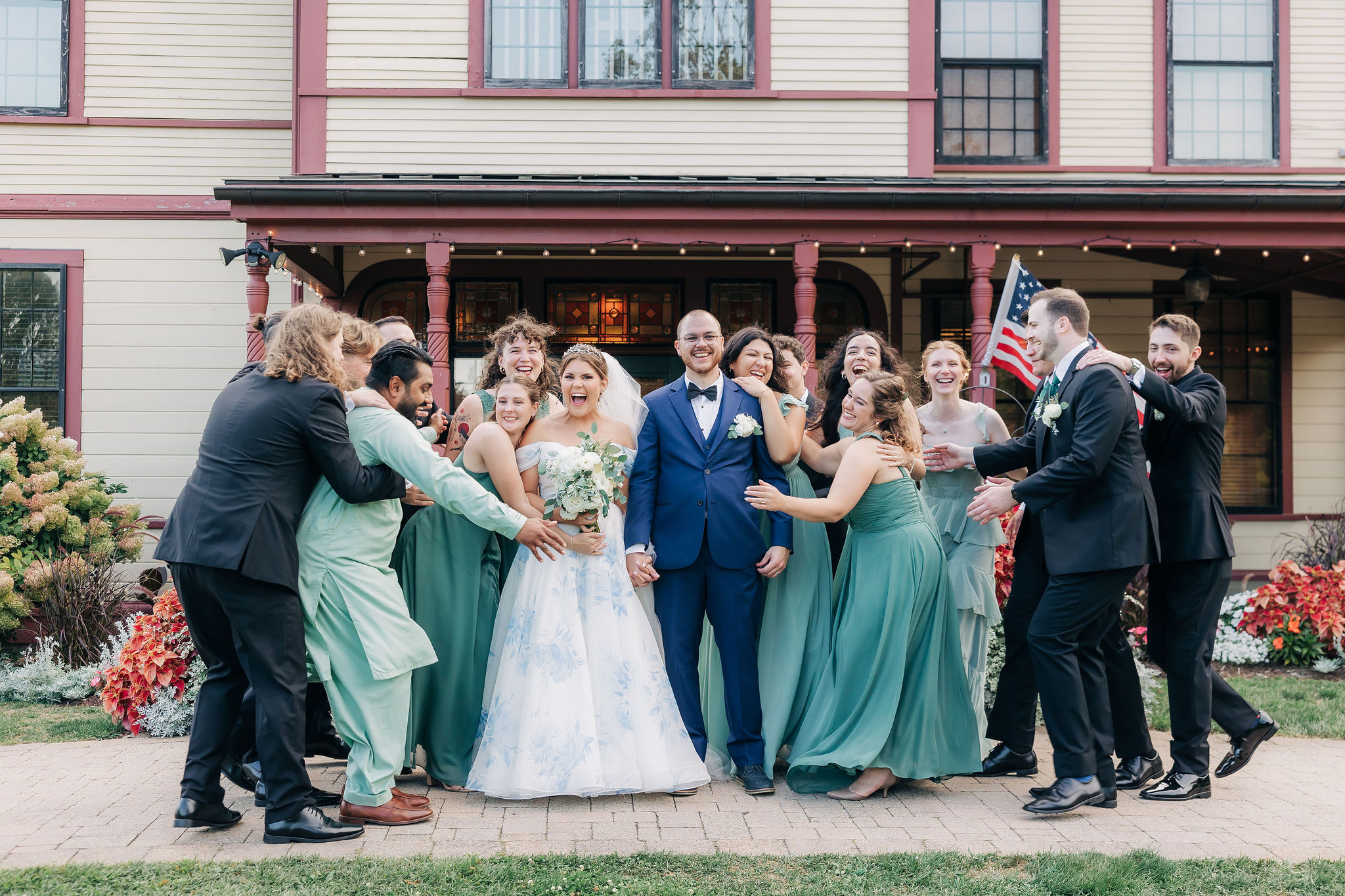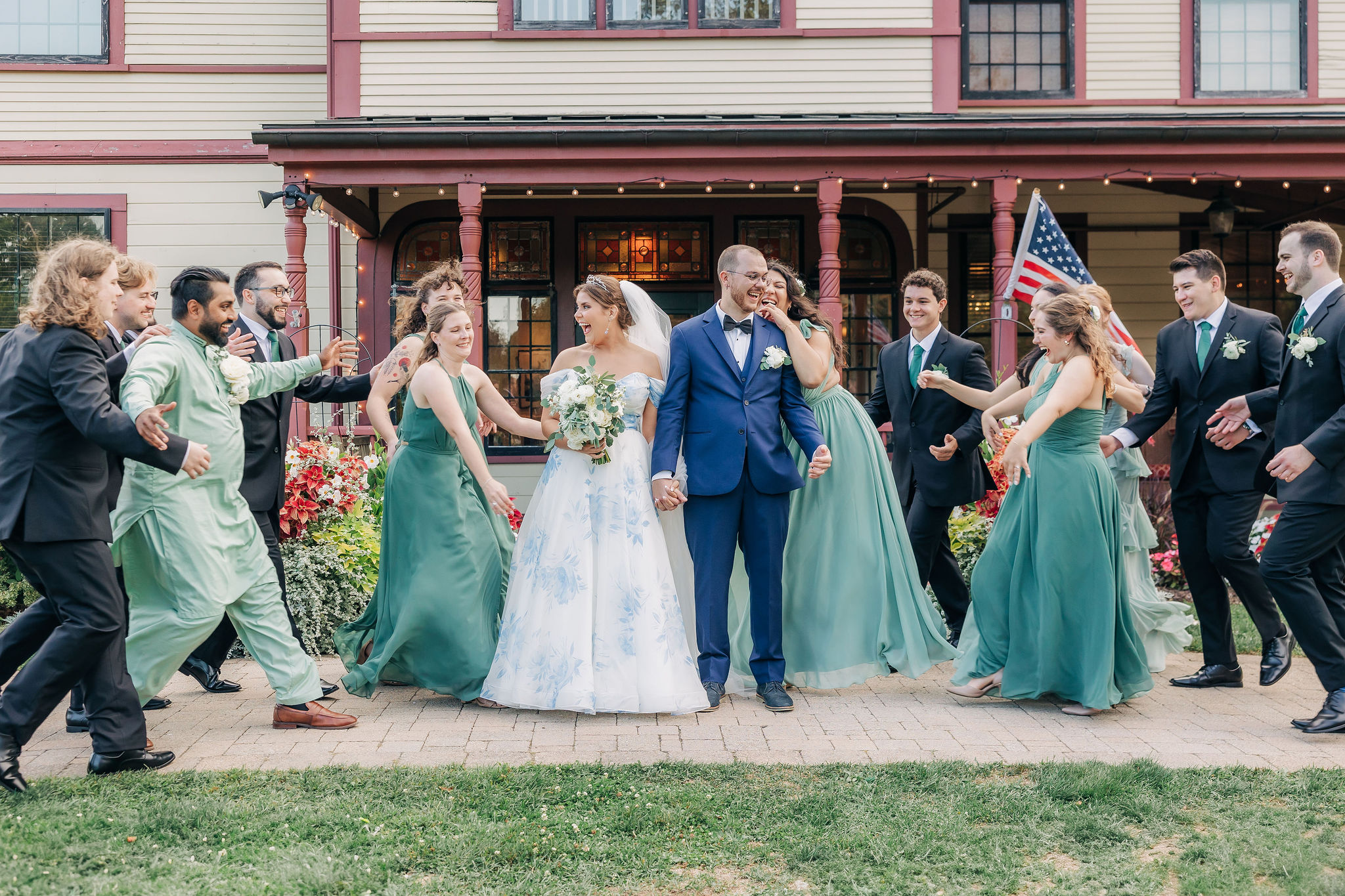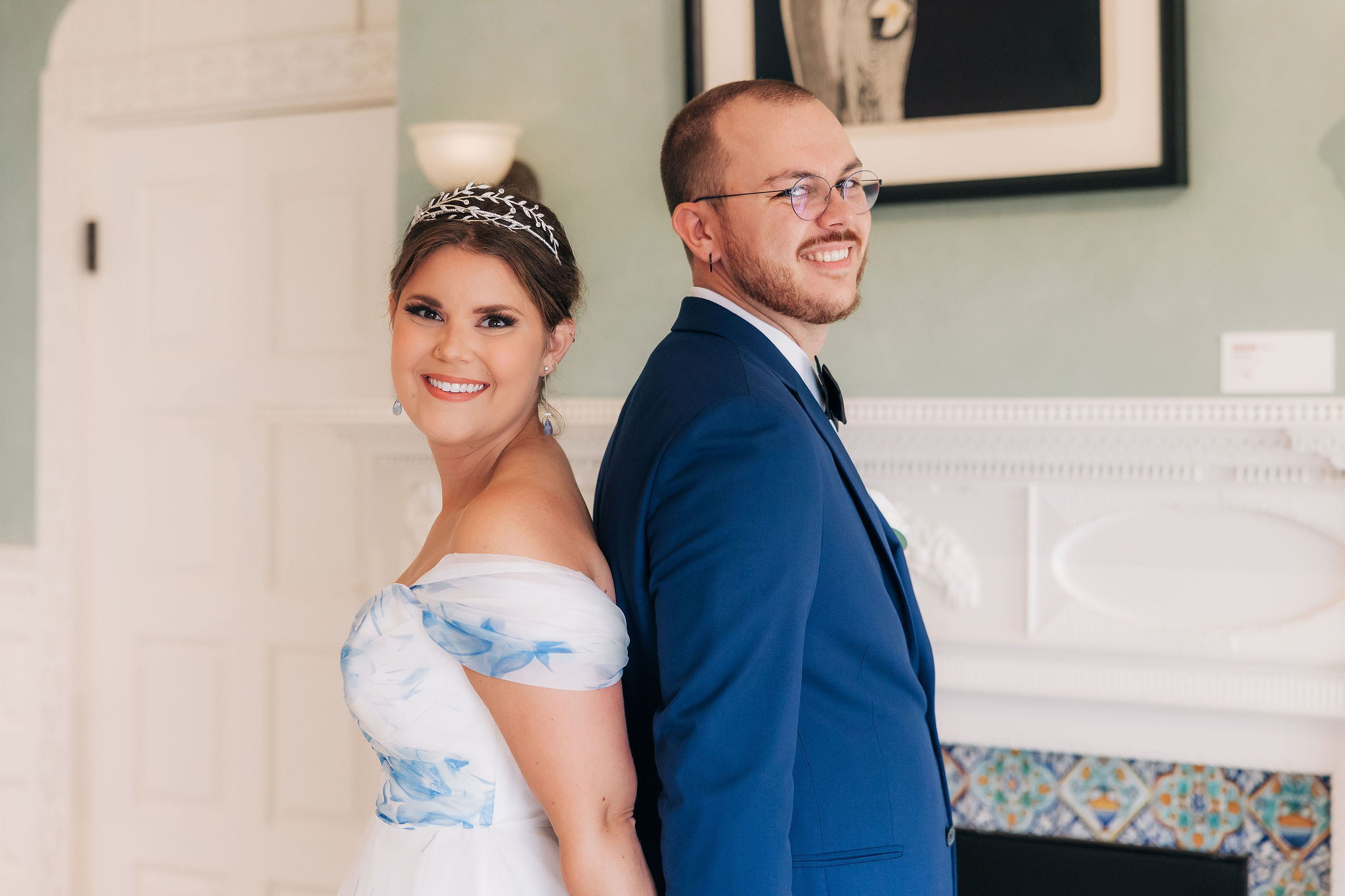 I knew for a long time that I didn’t want a fully white dress because I love color and I also wanted something unique! I wanted to tie the line of classy bridal with my own twist. Jared’s Aunt Julie showed me some pictures of dresses with prints and I fell in love with the idea of doing something like that. Julie suggested we go shopping at Your Dream Bridal in Sudbury, MA and as soon as I saw the Blythe dress I knew it was for me. It was the first dress I tried on and, even though I tried on a few other dresses, I knew it was my dress. I love the blue florals and the fabric is so light and comfortable it almost felt like I wasn’t wearing a dress. Julie is so spot on in reading each bride and figuring out what they are looking for!