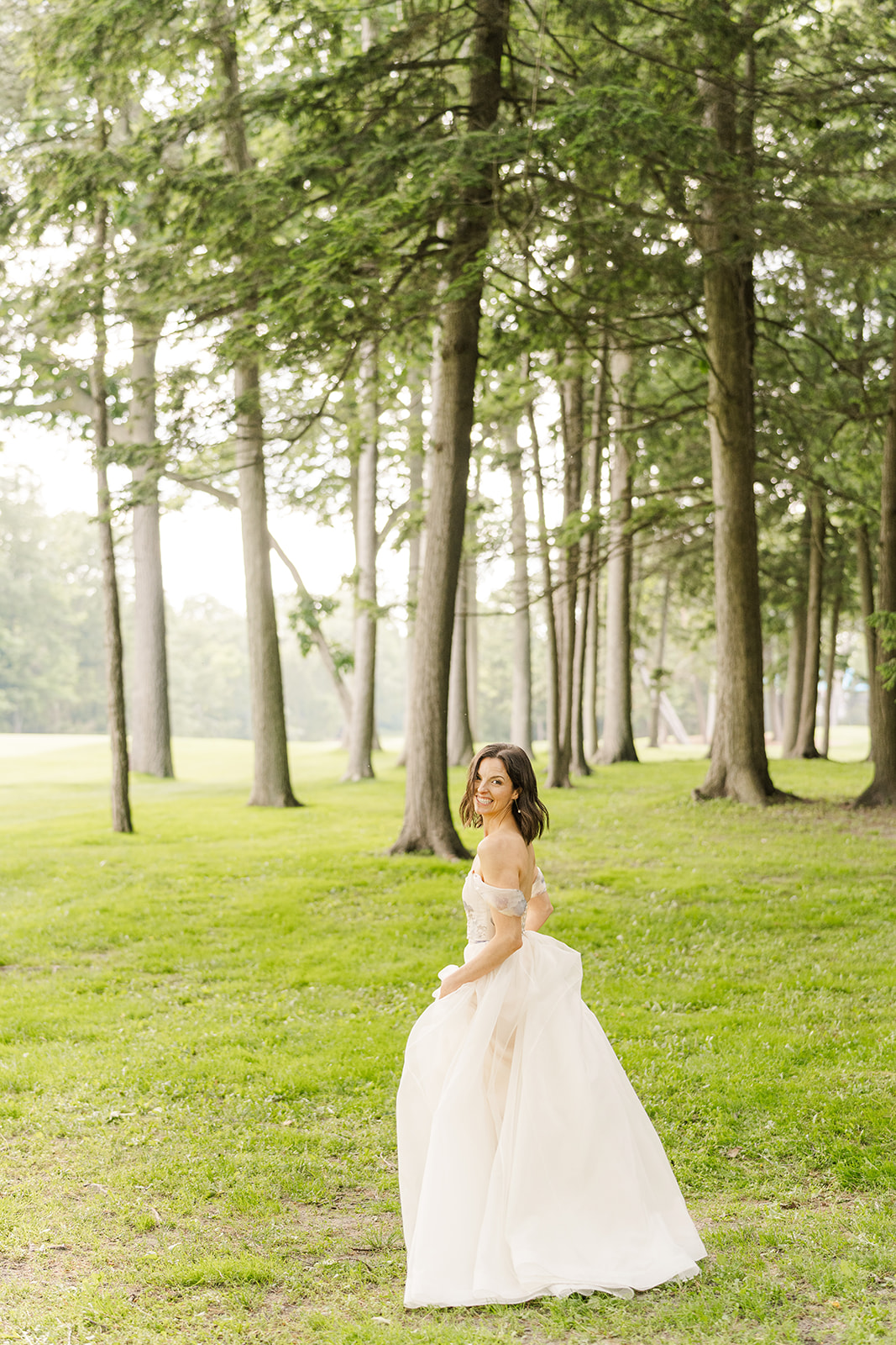 Michelle visited us at the Lea-Ann Belter Toronto bridal shop with a vision. She wanted color and romance. A classic wedding dress with a touch of magic. Upon hearing this, our owner and boutique stylist, Vanessa, knew a custom wedding dress was in the offing! Together, they created the gown of Michelle’s dreams: a watercolor floral-print bodice, fitted with detachable off-the-shoulder sleeves, paired with a floating organza skirt.