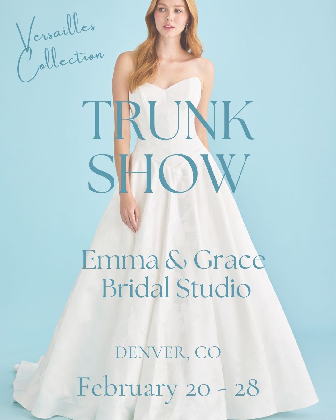 February 20 through 28, every new wedding dress and accessory (as well as a few favorites from previous seasons) will be at Emma & Grace Bridal Studio for you to take for a twirl. This trunk show is extra special since it marks the debut of our latest classic wedding gown styles in the Rocky Mountain state.