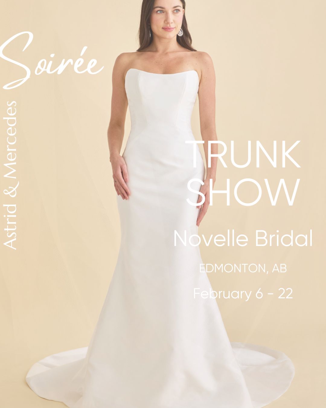 February 6 through February 22, there will be modern bridal gowns galore at Novelle Bridal. Our newest Soirée wedding dresses will be joining Novelle’s already gorgeous selection, so there will be wall-to-wall stellar silhouettes. Also along for the ride are a selection of our lovely accessories, including veils, jackets, and more!