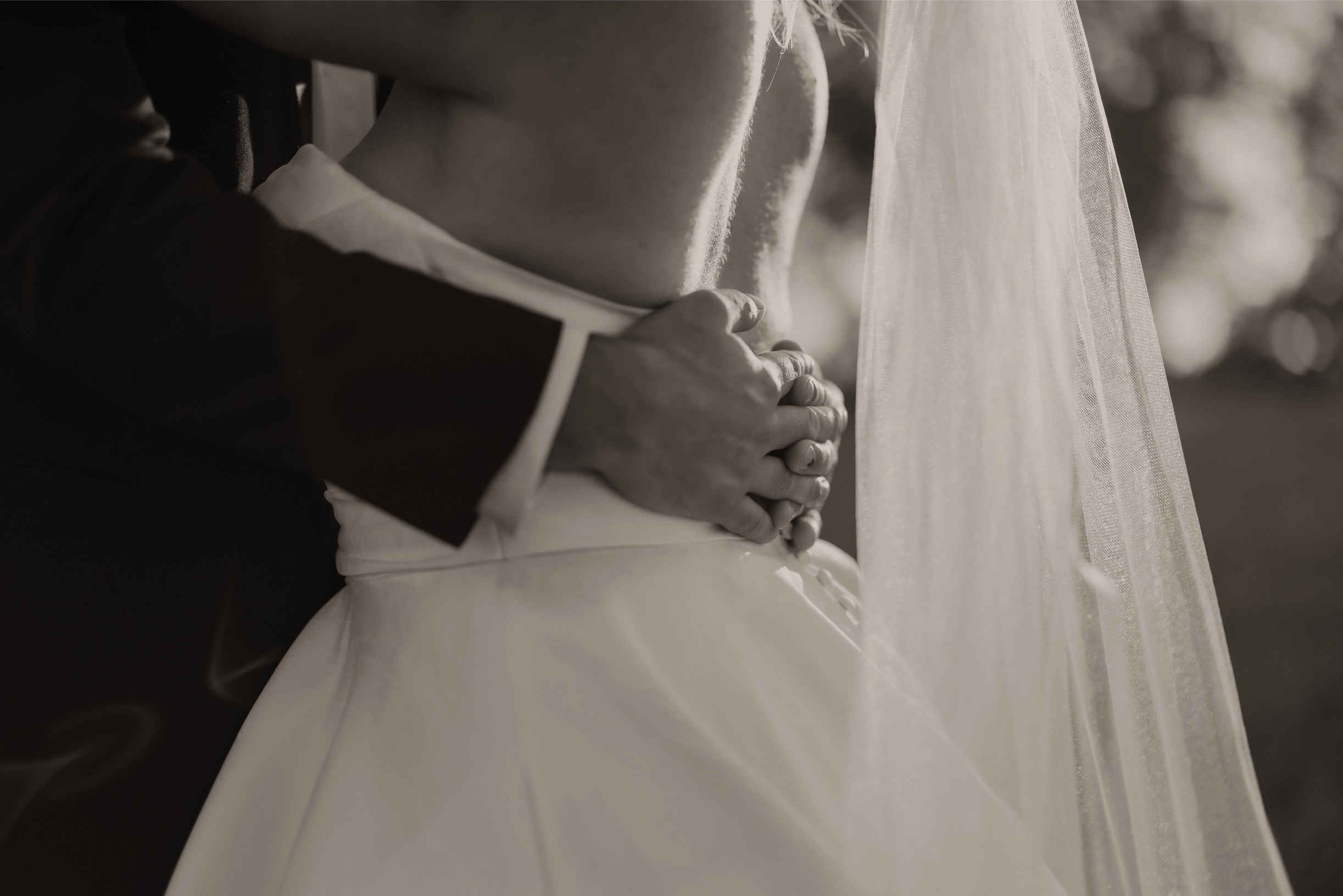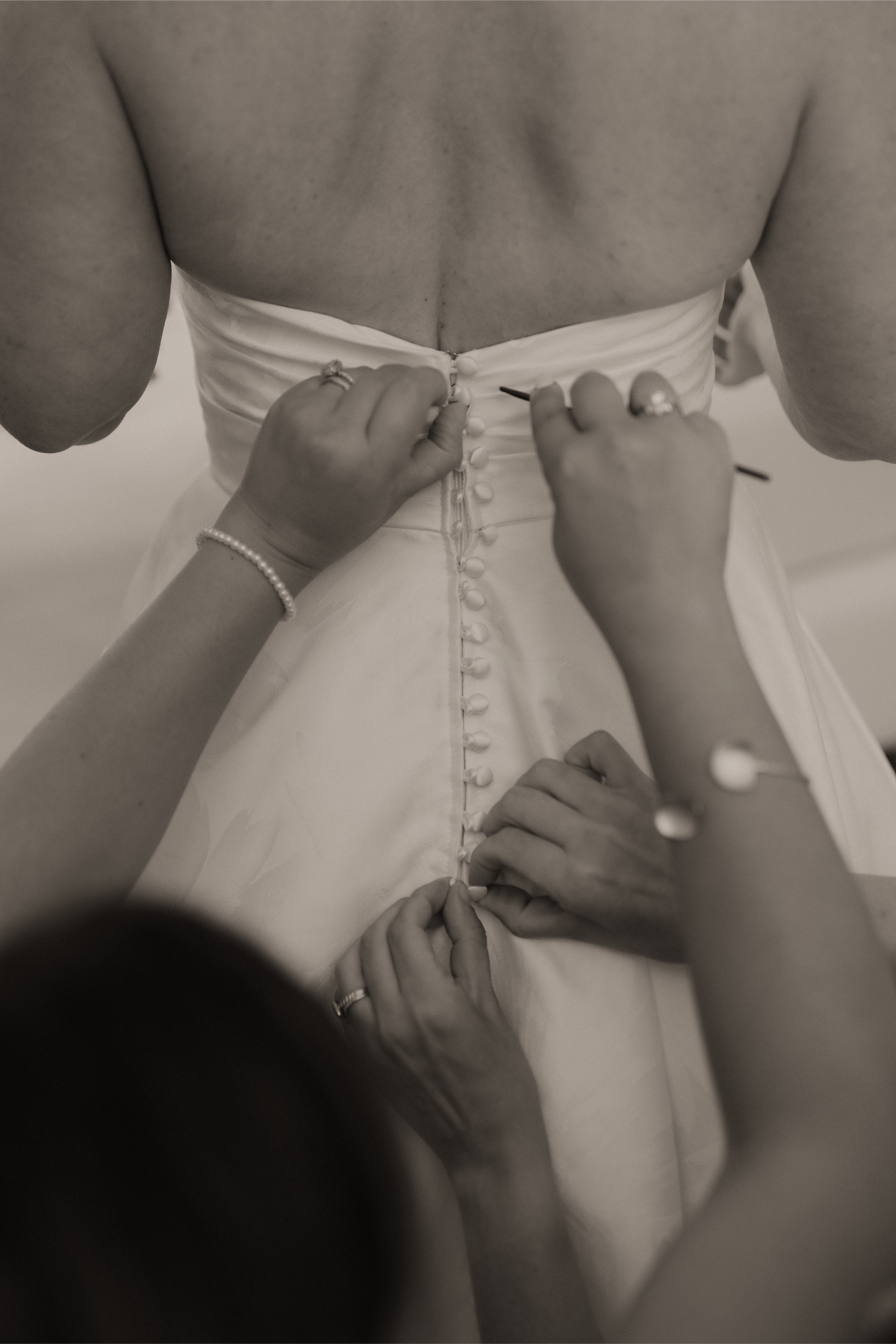 But, as she went to appointments and expressed the combination of style and intention she wanted, everyone told her a dress like that didn’t exist. Except Denise at The Persnickety Bride. “Instead of asking what I liked, she asked me to explain what I didn’t like about each dress I had tried on.” Then Denise pulled out the Esme gown. “The second I slipped it on, it fit like a glove. It checked every single box, I fell in love with the fabric and the subtle pattern, and I knew instantly it was the one.” On top of fit and aesthetic, Aileen’s intention for a gown made with care was fulfilled, too. “As I learned more about Lea-Ann Belter, it all clicked. The timeless style was exactly the kind of bride I had always envisioned being. The quality of the fabric, the fact that the gown is made in Canada, and the customization options completely sold me.” Most importantly, Aileen felt her most beautiful self “It felt like I was wearing the dress — not the other way around.”