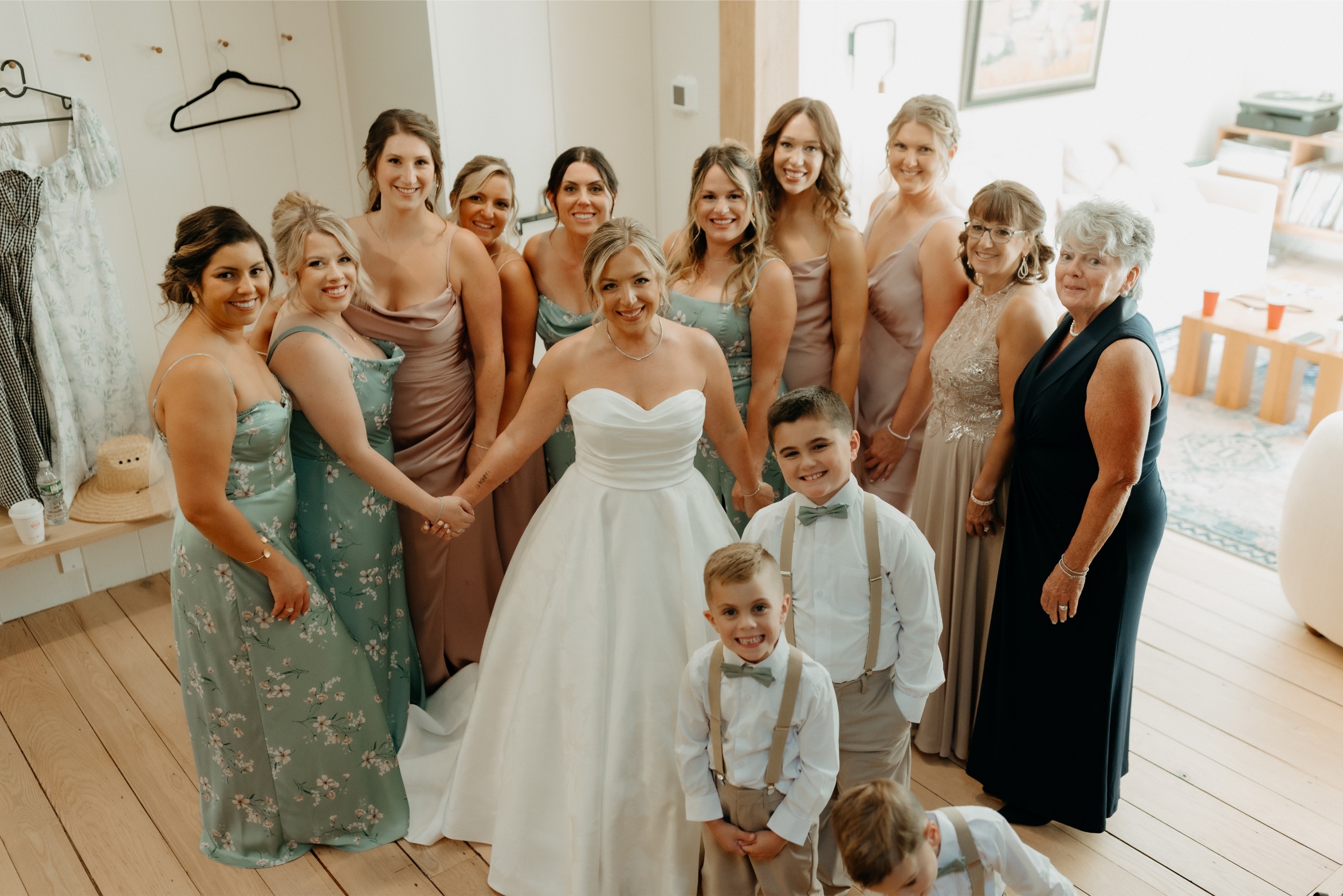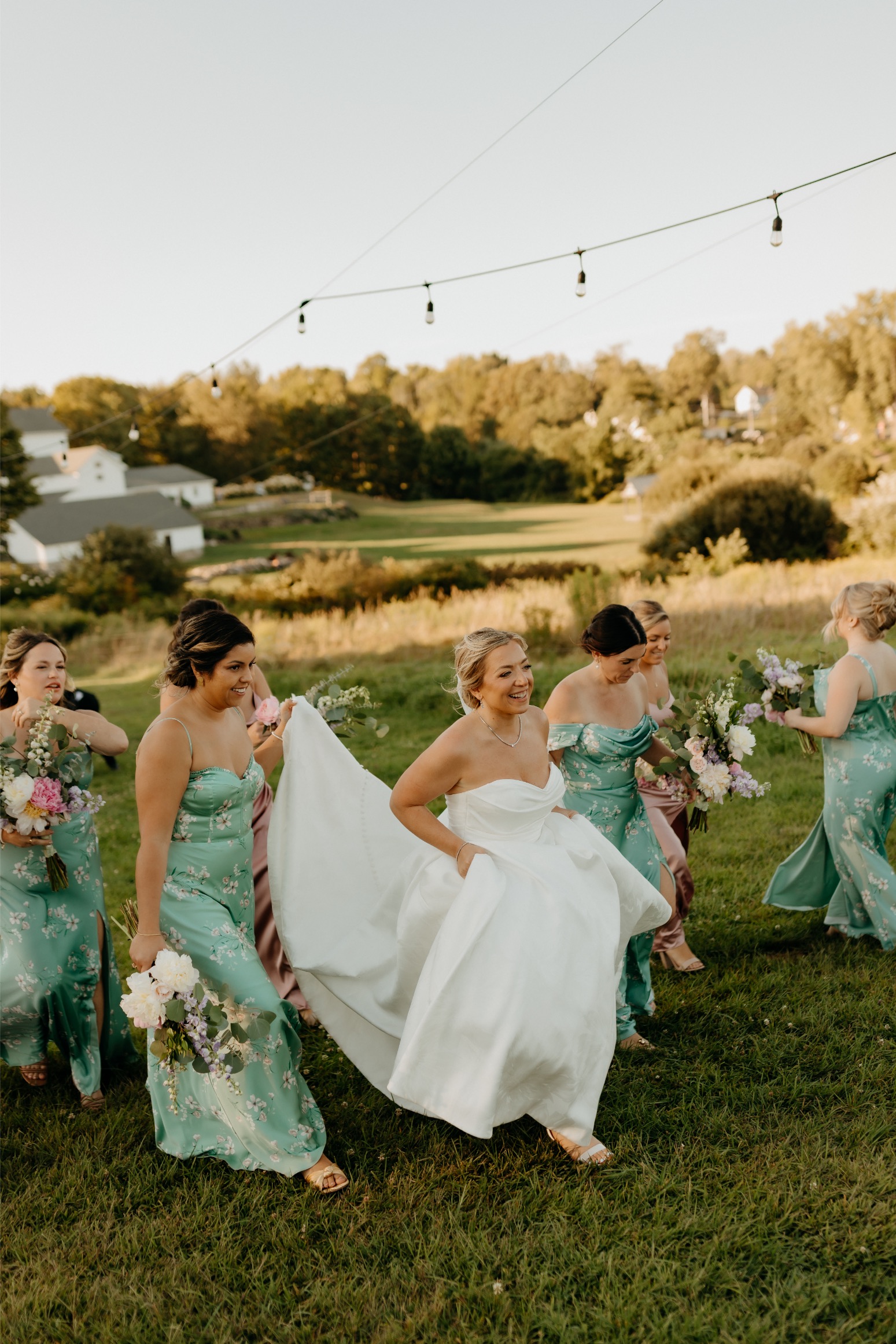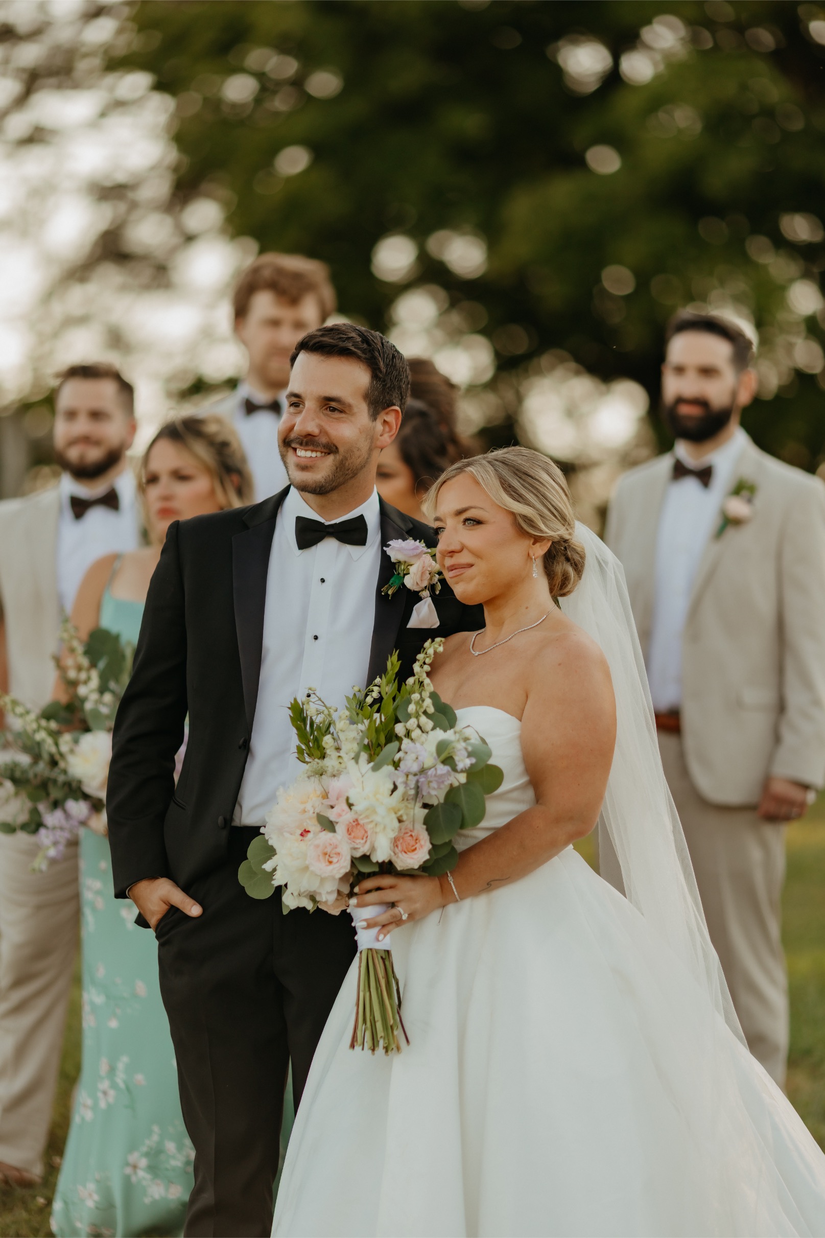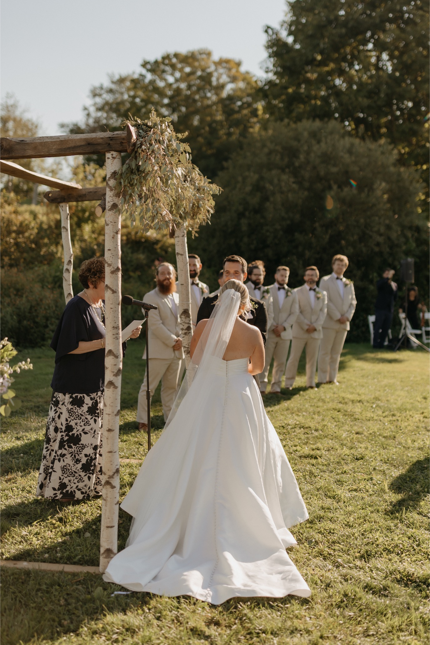 wedding dress: Lea-Ann Belter Esme with custom neckline via The Persnickety Bride | photographer: Evermore Imaging | venue: South Farms | florals: Cafe de Flore | make-up: Em McNulty Makeup | hair: Moxie by Majenta Mink | videography: Vows Studio NY | cake: Sugar Crystles | tuxes: Modern Formals | rings: Water Street Jewelers & Sylvie Jewelry | bridesmaids dresses: Birdy Grey