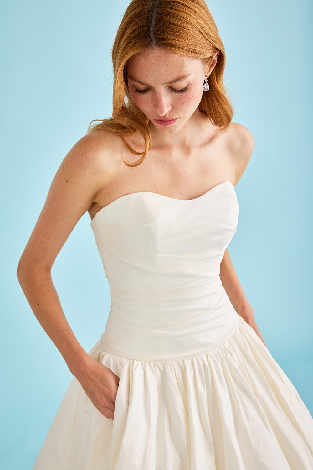 Sweeping orchestra music fills the room. Velvet drapes conceal the stage. All around is beauty and anticipation. Rendered in fine fabrics and precise seam work, the Nocturne bridal gown collection is inspired by a night at the opera. Classic couture techniques reveal themselves in these elegant wedding dresses through impeccable corsetry, crisp ruching, and rich draping. Destined for making an entrance, full and fit-and-flare skirts flow gracefully to the floor, and sashes sweep past dramatic trains.