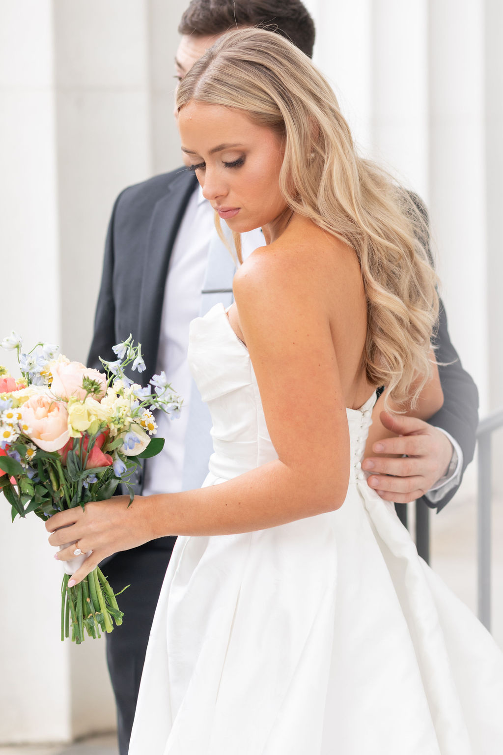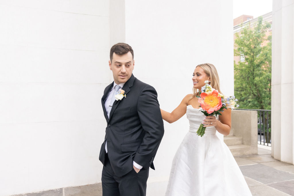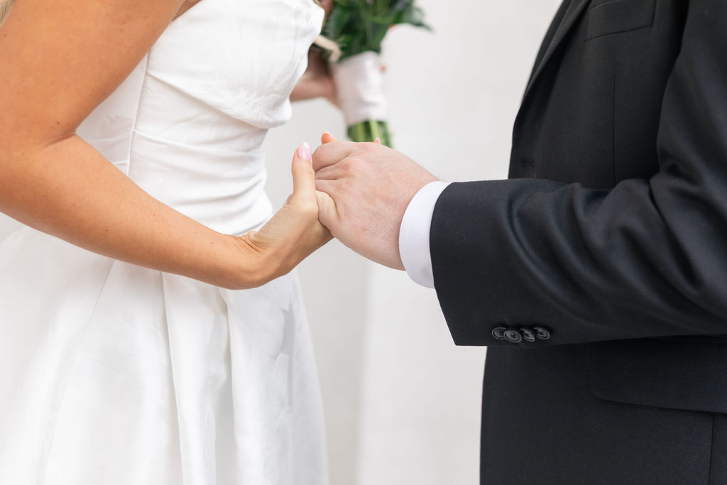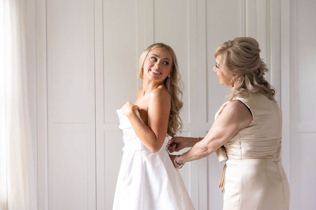 After at least five appointments, Aly was starting to lose hope that she’d find a classic wedding dress she loved. Nonetheless, she came back to Something Bleu Bridal in Saratoga Springs. Maybe there was something they’d missed! Her instincts were right. “I saw a dress on the mannequin, and something called me to it. On the most perfect day with just my mom and Taylor Swift playing in the shop, I found the one!”