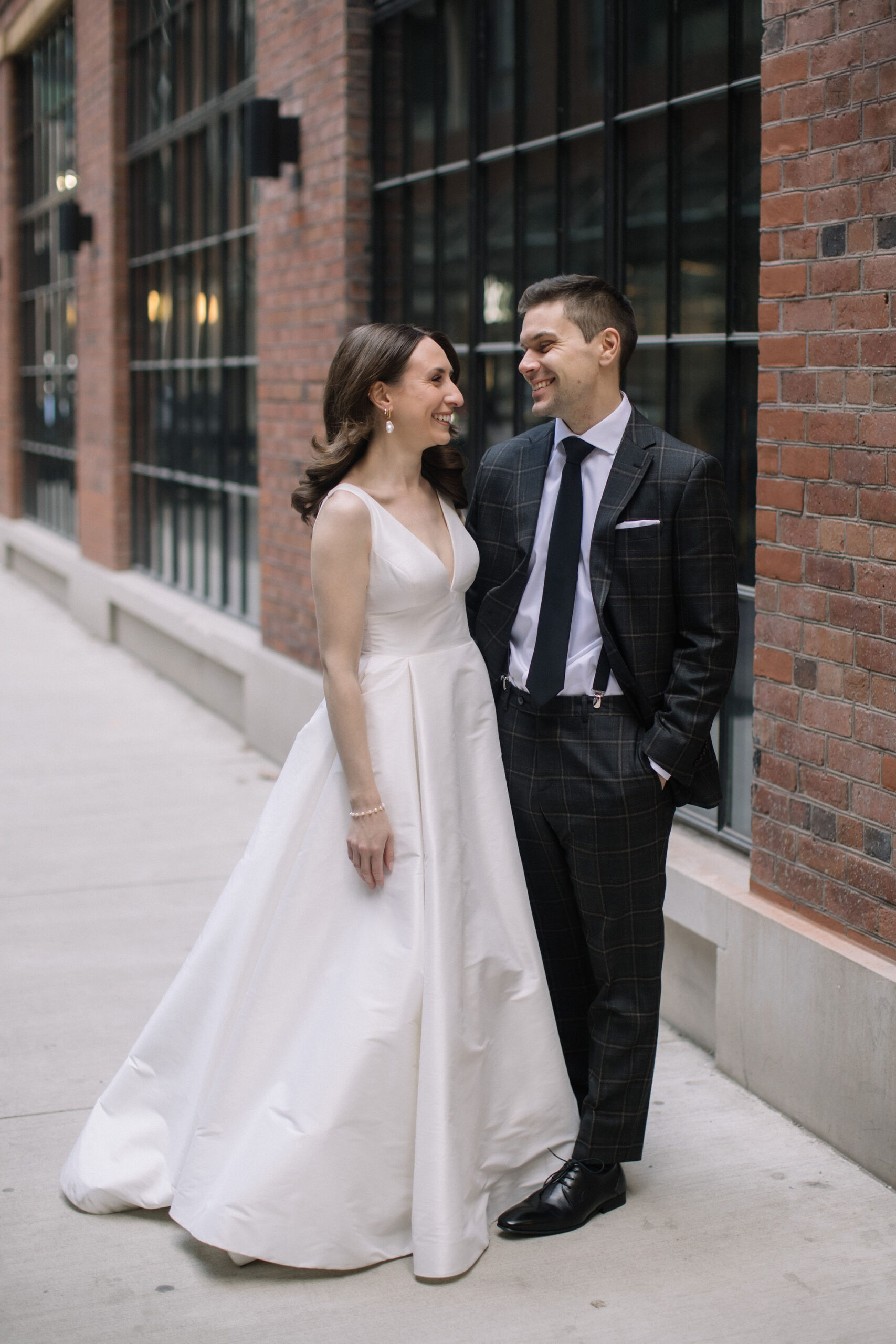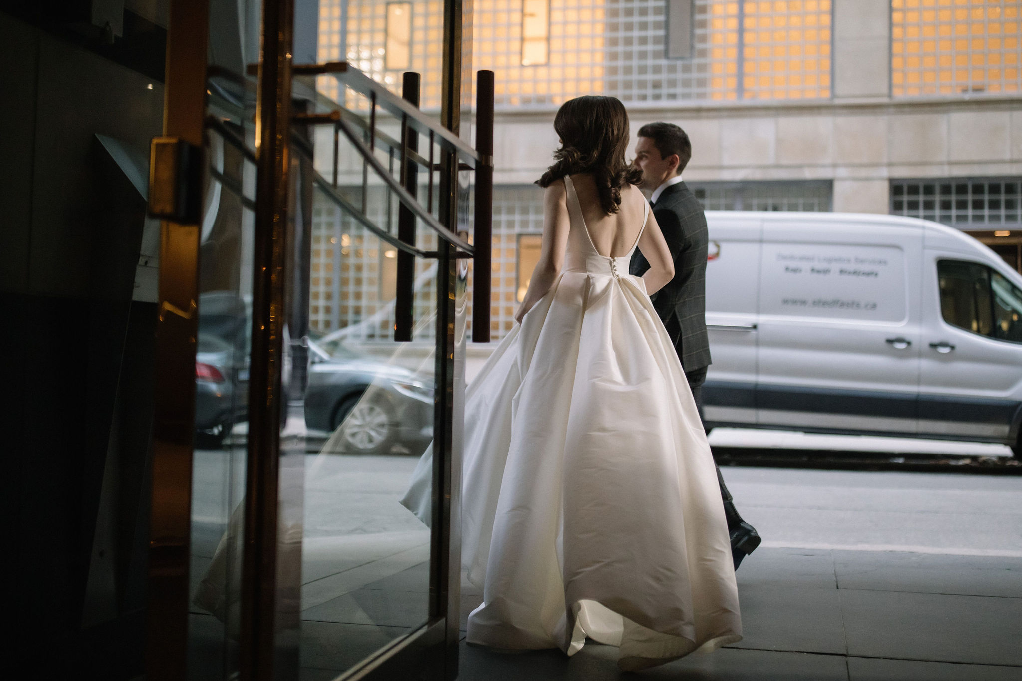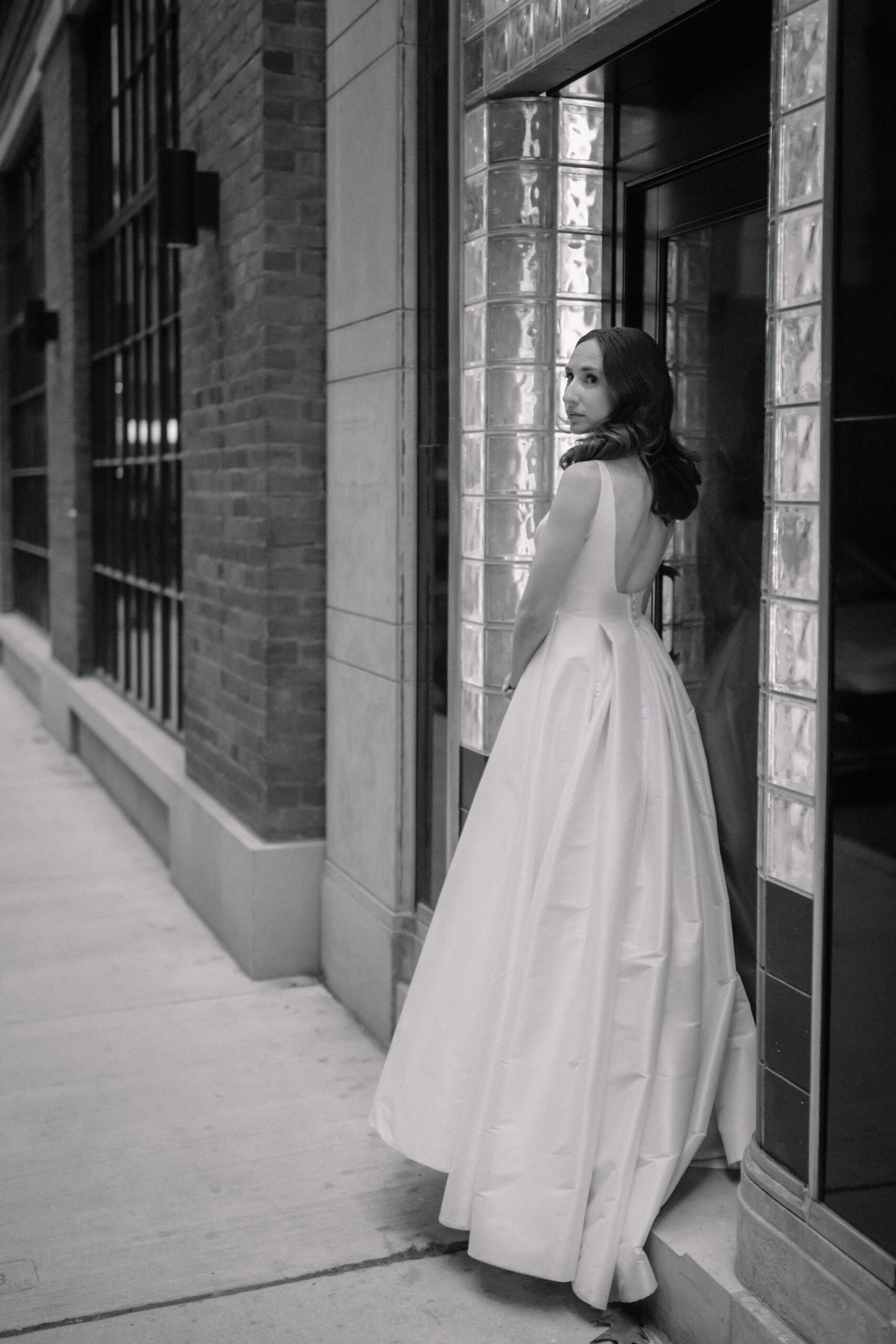As Carly visited Toronto bridal shops in search of a gown, she realized “ I didn’t feel like I was connecting with any of the dresses I was trying on.” When she arrived at the Lea-Ann Belter Bridal flagship boutique, she found the modern wedding dress she was looking for. “Vanessa was amazing – while we were trying different options we were discussing our mutual love of Mid Century Modern design and from that piece of information Vanessa was able to determine that I would probably gravitate towards a wedding gown that reflected the same era.”
